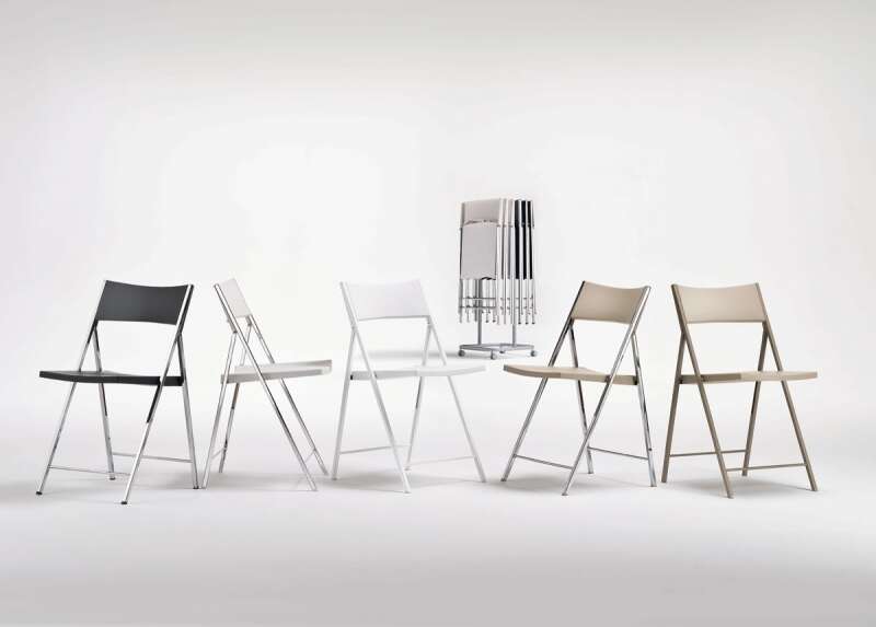 6 כיסאות מתקפלים הניתנים לאחסון על גבי מעמד ייעודי על גלגלים, דגם Fold
