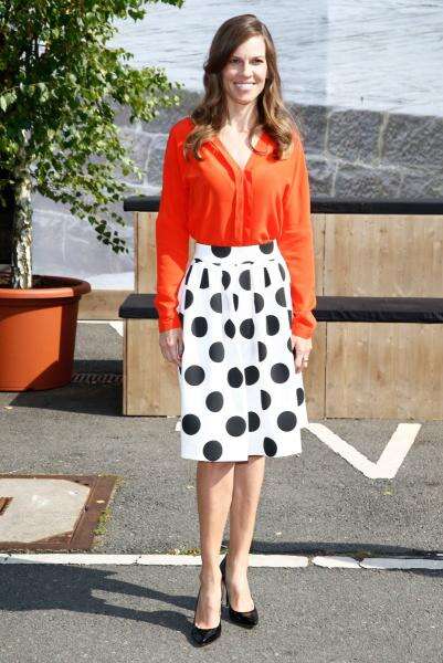 הנה משהו שאנחנו יכולות ללבוש אפילו לעבודה, ולקבל מבטים אוהדים. חצאית פולקה-דוט בשחור לבן, וחולצה בצבע הכי קיצי בסביבה.הנעליים מאוד סטנדרטיות למראה – שחורות וקלאסיות והאבזור דל עד לא קיים. מראה מאוד בסיסי, שבהחלט יכול לשרת אותנו בחיי היום-יום, ונראה נהדר על הילארי.