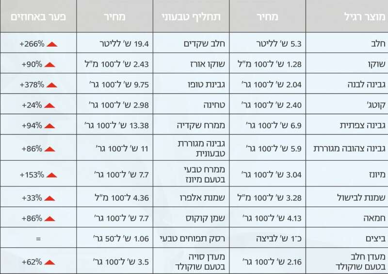 * כל המחירים נבדקו בסניף שופרסל שלי ברחוב ברזיל 17, תל אביב. כל המוצרים נבדקו מול המוצר המקביל בתפיסת העולם הטבעונית. הטבלה מורכבת ממוצרים בסיסיים ונפוצים