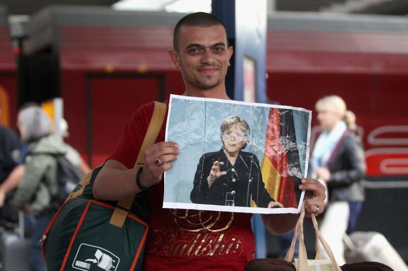פליט עם תמונת מרקל. הפכה לגיבורת הפליטים הסורים // צילום: אי.פי.אי