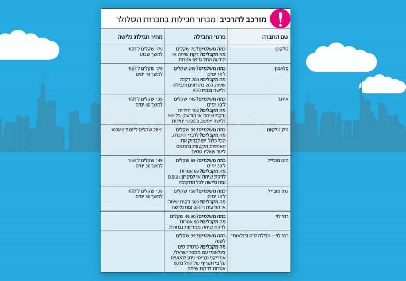 אז מה מציעות לנו חברות הסלולר? התשובה הקצרה היא - כמעט הכל. מגוון רחב של תוכניות, ששונות זו מזו בפרמטרים רבים והופכות עבורנו את הבחירה וההשוואה ללא פשוטות. בפלאפון, למשל, מציעים חבילה יקרה יחסית, בעלות של 249 שקלים, שכוללת 200 דקות שיחה, 200 הודעות ו־5 גיגה גלישה. החבילה מהווה יתרון למכורים לאינטרנט, אך פחות משתלמת לאלו שמחפשים בעיקר פתרון לשמור על קשר טלפוני עם הארץ (ראו טבלה).
