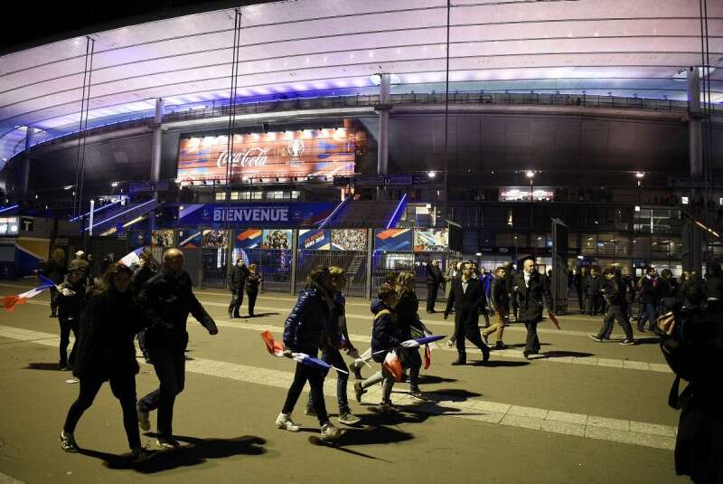 אחד ממוקדי הפיגועים, שגבה את חייהם של שלושה אנשים, היה בסמוך לסטאד דה פראנס בשעה שהתקיים בו משחק הידידות בין צרפת לאלופת העולם גרמניה. שחקני שתי הנבחרות ואלפי האוהדים ביציעים כלל לא היו מודעים לגודל האסון ברחובות העיר וסיפקו תמונה סוריאליסטית לחלוטין. בזמן שהגנת צרפת הניעה כדור וחיפשה פרצה בהגנת גרמניה, נשמעו שני פיצוצים אדירים בזה אחר זה, והמשחק המשיך להתנהל כסדרו. נשיא צרפת פראנסואה הולנד, שנכח באיצטדיון, עודכן מייד במתרחש ופונה מהמגרש. אבל זה היה רק בסיום, כשמעל הסטאד דה פראנס חג לו מסוק משטרתי, שהבשורה הקשה הגיעה לתחומי המגרש והובילה לפאניקה אדירה.