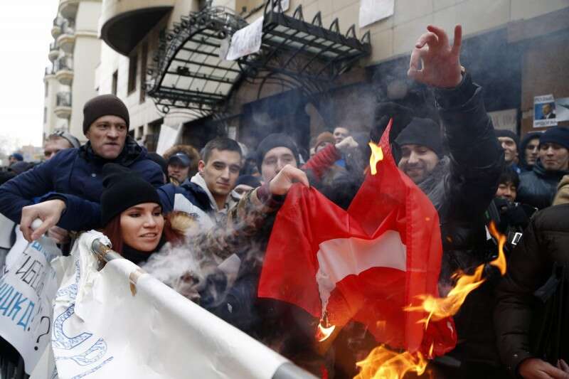 שורפים את דגל טורקיה מול שגרירות מוסקבה // צילום: אי.פי.אי