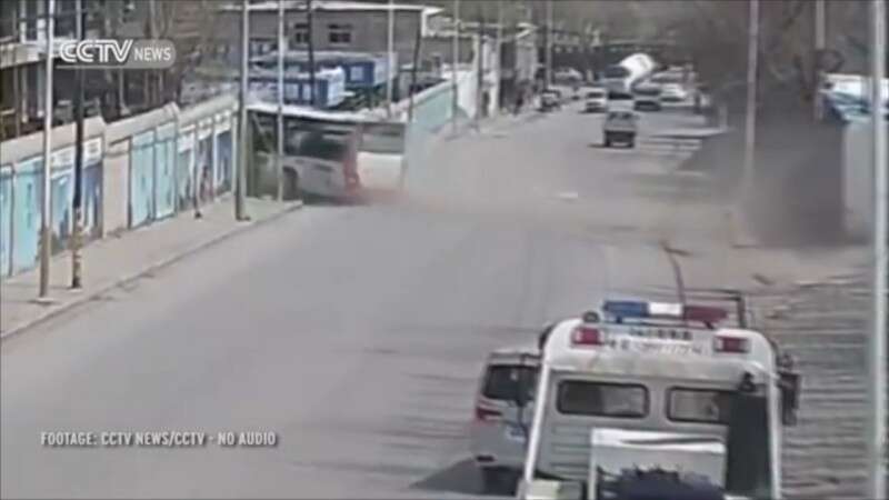 לאחר מכן הנהג/גנב חתך את הכביש ונכנס בקיר היישר לתוך אתר בנייה. מהמשטרה בסין נמסר כי "נהג האוטובוס המקורי שכח את המפתחות ברכב כאשר הוא מונע, ירד ממנו והלך לשירותים. לאחר פחות משלוש דקות הוא חזר וראה שהרכב נעלם".