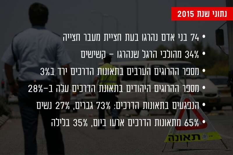 מספר ההרוגים הערבים בתאונות דרכים ירד ב-3% לעומת שנת 2014 (95 לעומת 98), בעוד שמספר ההרוגים היהודים בשנת 2015 עלה ב-28% לעומת שנת 2014 (194 לעומת 152). מכלל הנהגים שהיו מעורבים בתאונות דרכים עם נפגעים 73% היו גברים ו-27% נשים (אחוז הנשים מכלל המורשים לנהוג בשנת 2015 הגיע ל-43%).