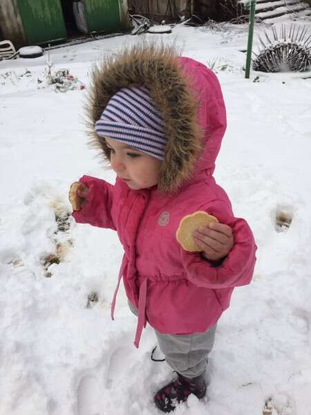 שחר ושני שומר משחקות בשלג בשמורת מירון // צילום: אילנה שומר