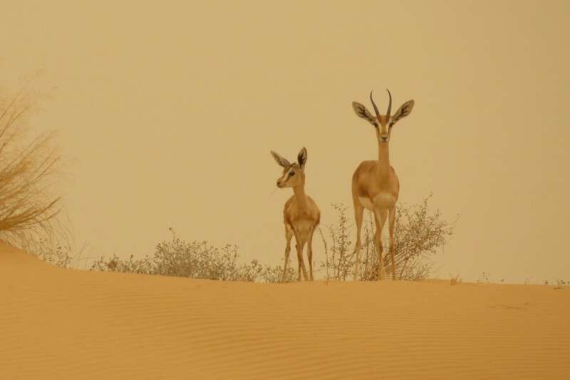 נקבת צבי נגב עם עופר ביום של סופת אבק // צילום: גל ביסמוט