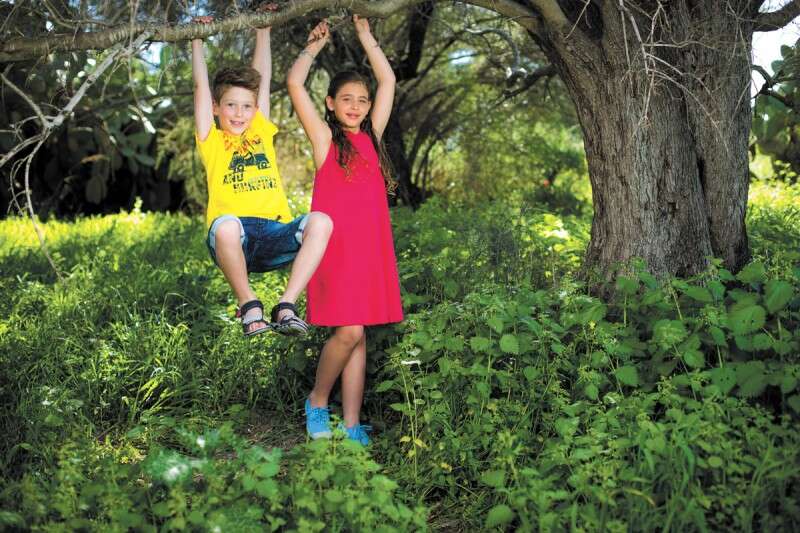 5 איתי לובש טי-שירט (דלתא קידס, ('ש 59.90 וג'ינס (שילב, ('ש 129.90 ונועל סנדלים (גלי, ('ש 199.90 • ארין לובשת שמלה (שילב, ('ש 129.90 ונועלת נעליים (פפאיה, ('ש 149