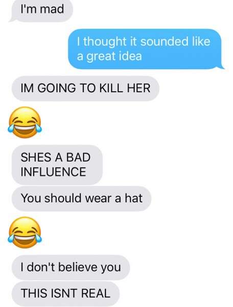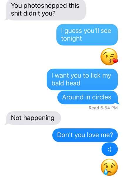 אמנדה העלתה את השתלשלות השיחה ביניהם לצד הכיתוב: "הייתה לי אפליקציה להקרחה על הטלפון, והחלטתי לשלוח תמונה לחבר שלי מתוך מחשבה שהוא יבין שמדובר בבדיחה. ובכן, מסתבר שהוא לא חשב ככה, אז זרמתי עם זה".
