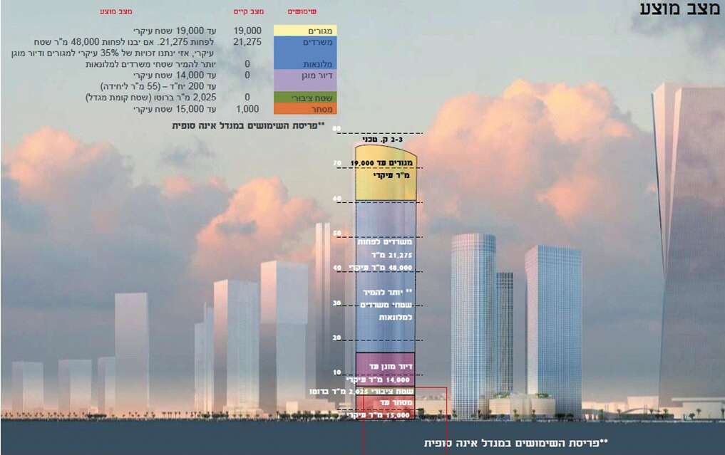 המגדל החדש יתנשא לגובה 90 קומות, ויהיה המגדל השני בגובהו בארץ. כ־40 קומות במגדל החדש יוקצו לתעסוקה, וכן יוקמו בו גם כ־200 יחידות של דיור מוגן - 60 דירות קטנות (עד 65 מ"ר) ו־240 יחידות דיור של כ־100 מ' ממוצע לדירה.