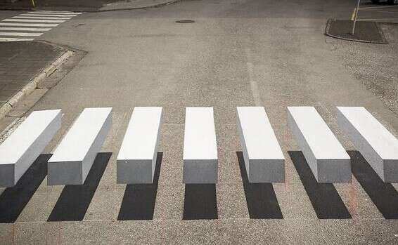 הפסים הלבנים של אחד המעברים בעיר נצבעו מחדש בצוaרה תלת ממדית, כך שהנהגים נהנים מאשליה אופטית מרהיבה והפסים נראים כמו עמודי בטון שמזדקרים מהאספלט. מלבד התחושה שהעיצוב החדש מעניק להולכי הרגל כאילו הם הולכים באוויר, הוא גם מושך את עיניהם של הנהגים המתקרבים למעבר החצייה.