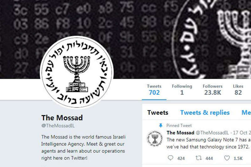 סמלו של ה"מוסד למודיעין ולתפקידים מיוחדים", ארגון הביון היוקרתי של ישראל מעטר חשבון ברשת החברתית טוויטר. תחת השם "המוסד" וההאשטאג @theMossadIL נכתב כי "המוסד הוא ארגון הביון המפורסם של ישראל". החשבון נפתח בשנת 2016, המיקום שאותו הוא מציין שממנו הוא פועל הוא ישראל והציוצים בו כתובים בשפה האנגלית בלבד.
