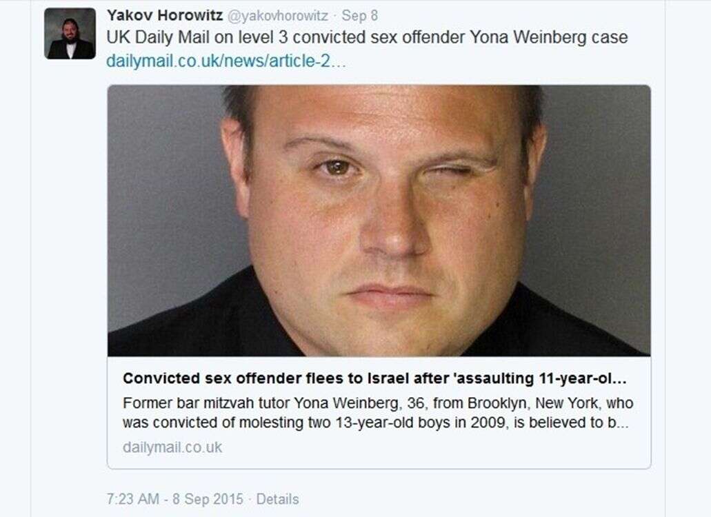 וינברג, שעלה לישראל בשנת 2014, לאחר שהורשע בעבירות מין חמורות בילדים, ריצה עונש מאסר בכלא, והוגדר על ידי רשויות החוק בארצות הברית כעבריין מין ברמת סיכון הגבוהה ביותר הקיימת בעבירות בתחום זה. כעת מסתבר, שלאחר שחרורו מהכלא פגע בילדים נוספים, וכאשר הבין שהחבל סביבו מתהדק, ברח ועלה לישראל. לאחרונה, רשויות החוק במדינת ניו יורק הכריזו עליו כעבריין מין מבוקש.