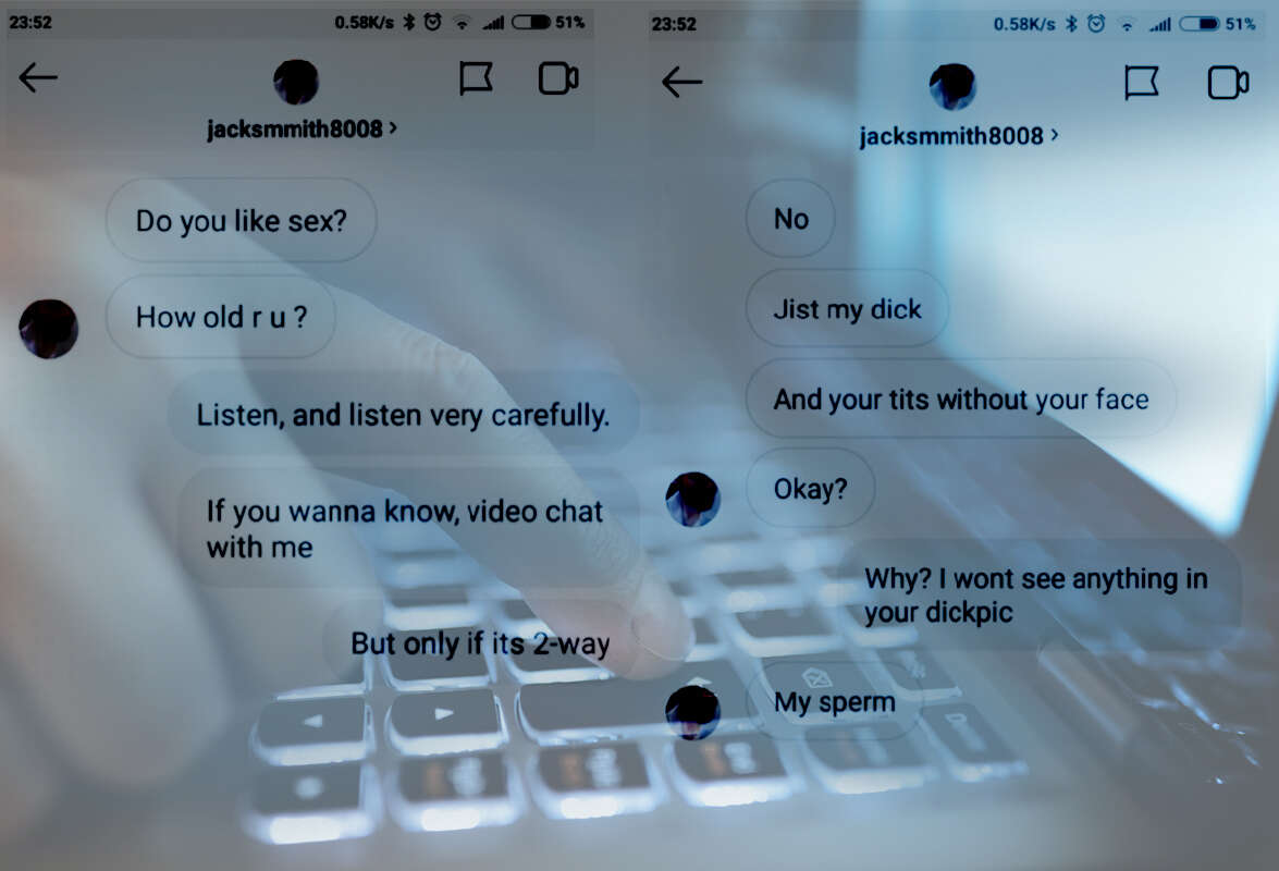 בהתכתבות החמורה שהגיעה לידי "ישראל היום", שואל האיש שמכנה את עצמו Jacksmmith8008 את הילדה - "האם את אוהבת סקס?". בתשובה מבהירה לו הילדה שהיא רק בת 14, אך זה לא מפריע לו להמשיך - "תראי לי את הציצים שלך, אני אחשוף את איבר המין שלי בפנייך".