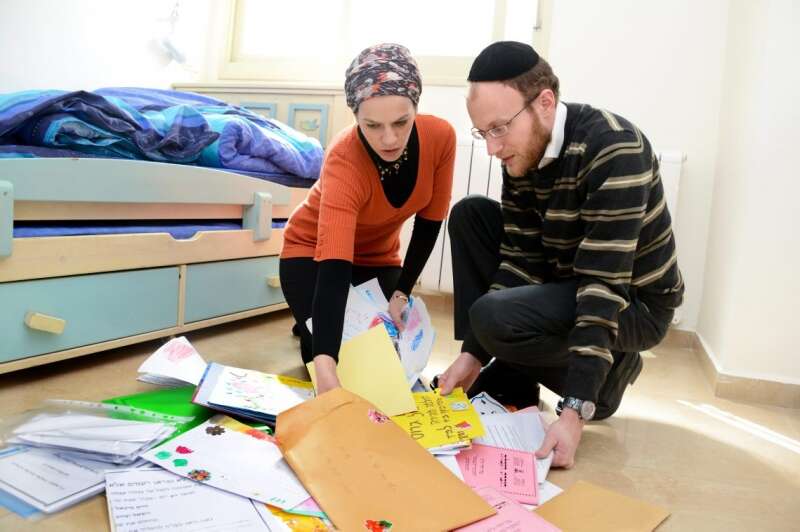 שימי ומיכל גרוס בביתם, אלפי מכתבים נשלחו אליהם, ושקים של ציורים. צילום: מאיה באומל בירגר