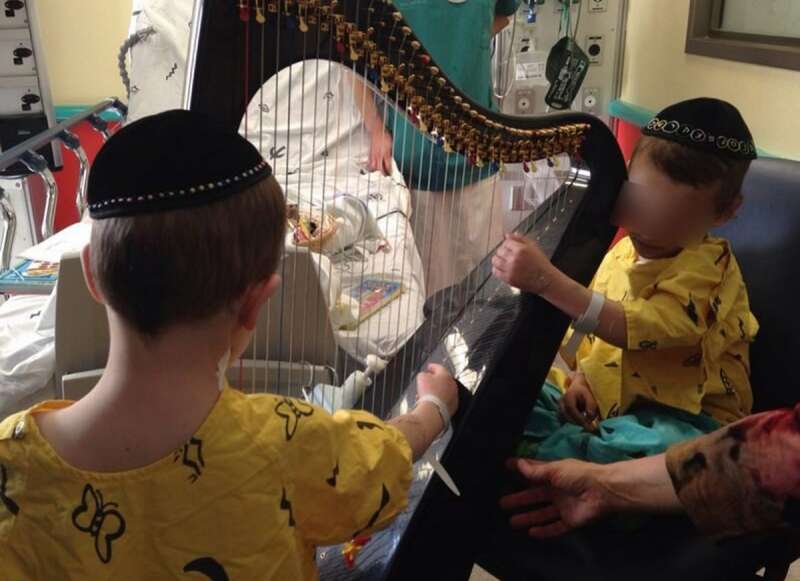 הילדים יצחק ומיכאל פורטים בנבל בבית החולים, אחרי ששבו להכרה. צילום: מרכז שניידר לרפואת ילדים