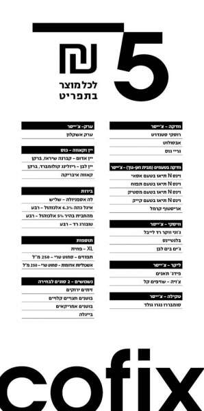 רשת קופיקס חוללה מהפך במחירי בתי הקפה וכעת היא מנסה להתחרות במחירי האלכוהול ש"סבלו" מעליית מחירים דרמטית בשל עדכון המיסוי. הרשת השיקה היום את קופיקס בר, המציע מגוון סוגי אלכוהול בחמישה שקלים. הבר נפתח ברחוב לילינבלום 21 פינת הרצל בת"א.