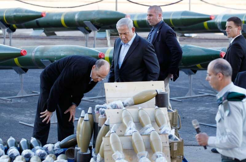 נתניהו ויעלון סוקרים את פצצות המרגמה 120 מ"מ. צילום: רויטרס