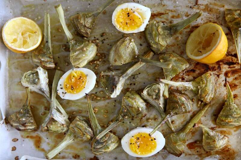 מגישים את הארטישוקים לצד הביצים וסוחטים מעל מהלימון הצלוי.
