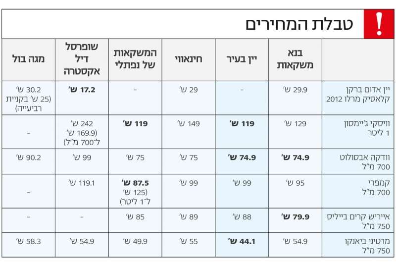 המחירים נבדקו ב־2.4 בסניפים הבאים: בנא משקאות, רחוב לישנסקי ראשון לציון; יין בעיר, רחוב לישנסקי ראשון לציון; חינאווי, מתחם G ראשון לציון;