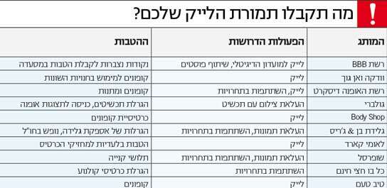רשת BBB לא לבד. תוכלו למצוא בפייסבוק עשרות עמודי מותג שינסו לשכנע אתכם ללחוץ על הלייק בתמורה לשלל הטבות והשתתפות בהגרלות מפתות: רשת שופרסל העניקה לאחרונה 200 שקלים בתלושי קנייה לגולשים שהעלו צילומים של תחפושות בפורים, ולאומי קארד מפעילה עמוד המעניק ללקוחות מגוון הטבות בלעדיות.