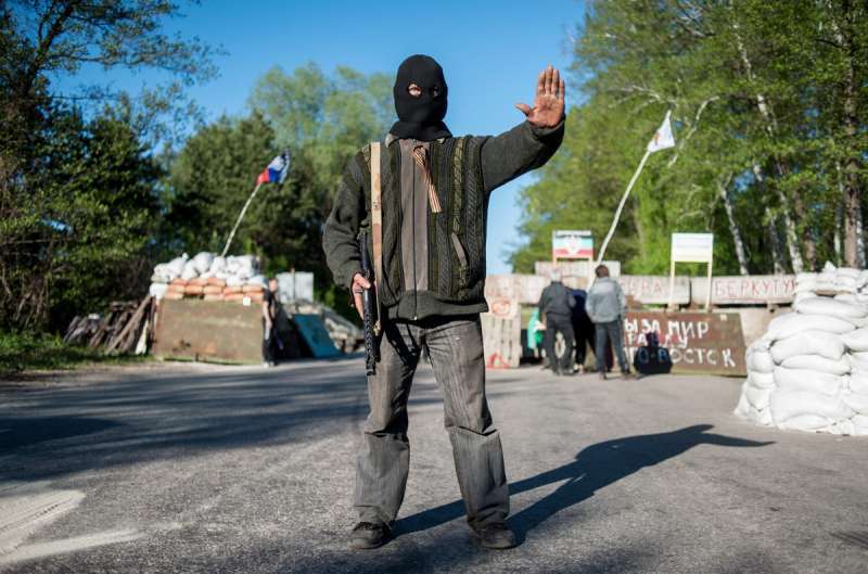 פעיל פרו־רוסי חמוש בנקודת בידוק בעיר קרסני לימן, אתמול // צילום: אי.פי.אי