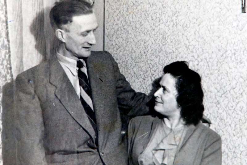 משמאל: ישראל ורעייתו בת שבע עם חברים, בלודז' אחרי המלחמה