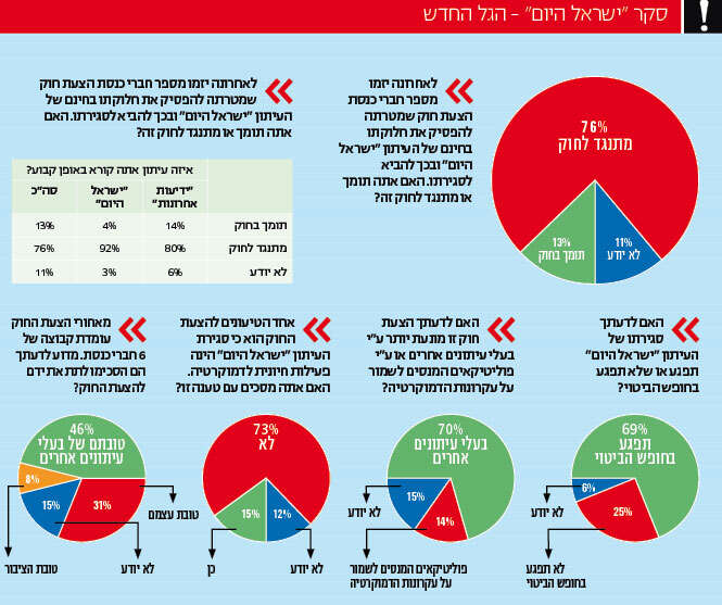 הציבור מתנגד - בתוקף! - להצעת החוק האמור לאסור חלוקת עיתונים בחינם, ומכוון באופן ספציפי נגד "ישראל היום" כדי להביא לסגירתו. כך עולה בבירור מתוצאות סקר שערך השבוע "ישראל היום" באמצעות מכון המחקר הגל החדש, אשר אינן מותירות מקום לספק: 76% מהמשתתפים בסקר מתנגדים לחוק, ורק 13% תומכים בו.