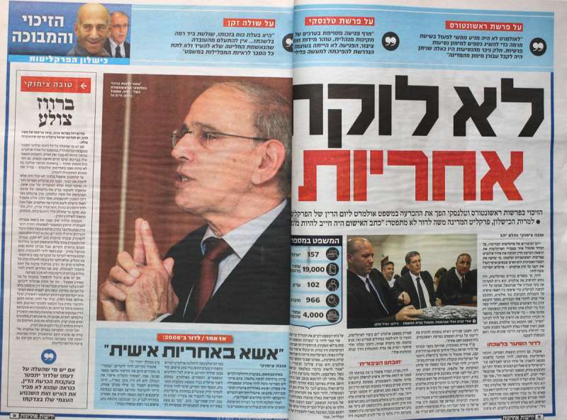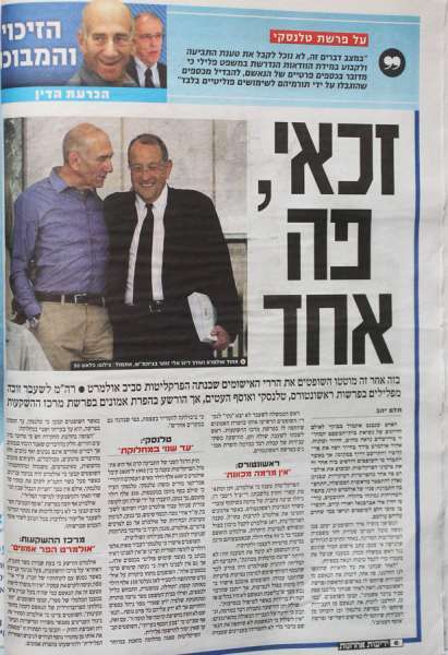ואוטוסטרדת התמיכה נמשכת. "האם יוזכר שם כמי שנחשב על ידי לא מעט אנשים כאחד מראשי הממשלה הטובים שהיו כאן. האם יהיה מקום לציין את אומץ לבו במקרים שעליהם אנו לומדים ממקורות זרים, על המאמצים שלו להגיע להסכם שלום עם הפלשתינים או על כך שכהונתו היתה תור הזהב של מדינת ישראל ביחסיה עם העולם", מתרגשת סימה קדמון בעמוד 3. "לא צריך להיות פסיכולוג כדי להבין שרוזן לא אהב את אולמרט", היא מוסיפה ומנחמת: "זה לא סוף דבר. אולמרט יערער לבית המשפט העליון".