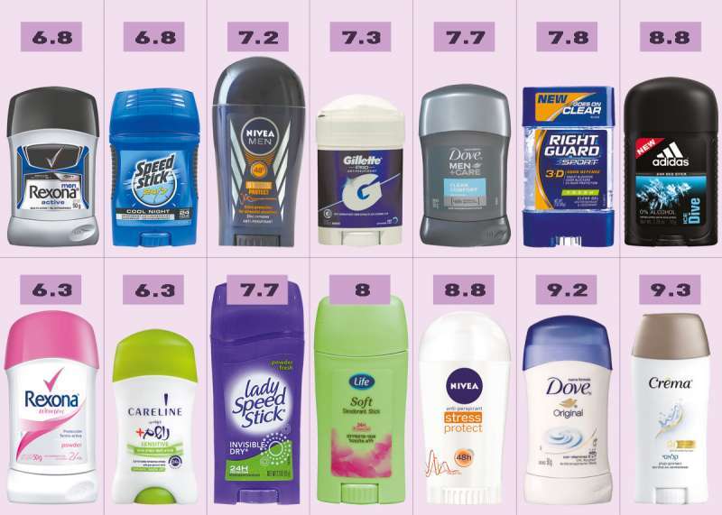 לקראת הקיץ החלטנו לבדוק איזה מהדאודורנטים המובילים אכן עושה את העבודה. סיפקנו לעובד נוי בקיבוץ, לנהג מונית ולספורטאי שבעה דאודורנטים מסוג סטיק לגברים, ולמורה להתעמלות, למזכירה ולמלצרית שבעה דאודורנטים מסוג סטיק לנשים. הם התבקשו למרוח את הדאודורנט לפני שהם יוצאים לעבודה ולראות אם ועד מתי הוא מחזיק מעמד, איך המרקם, איך הריח ואם הוא מכתים את הבגד. בסוף אותו יום הם דירגו את הדאודורנט בציון שבין 1 ל־10 וציינו את הערותיהם. התוצאות לפניכם.