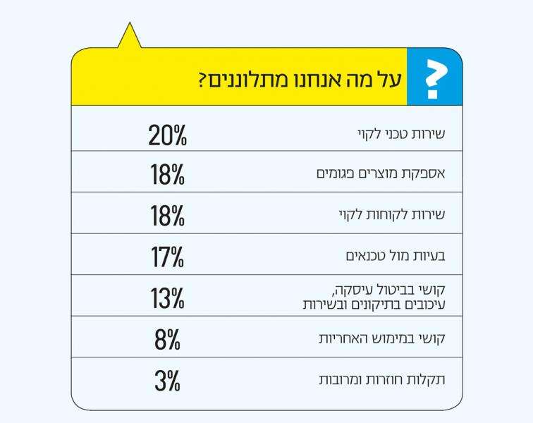 מניתוח התלונות שמתקבלות בארגון עולה כי מרביתן, כ־20%, עוסקות בשירות טכני לקוי. אחד המתלוננים, לדוגמה, הזמין טכנאי בעקבות מזגן תקול, שקבע שיש להחליף את כרטיס הפיקוד. הביקור עלה ללקוח 250 שקלים, אבל אחרי כשבוע הגיע הטכנאי להחליף את הכרטיס וגבה 550 שקלים נוספים. לאחר כמה ימים שוב התקלקל המזגן. כשהגיע שוב טכנאי, הוא קבע שיש להחליף את המדחס בעלות של 2,500 שקלים. "בזבוז" הכסף הזה היה יכול להימנע אילו הטכנאי הראשון היה עורך בדיקה מקיפה, מאתר את הבעיה האמיתית ופותר אותה במקום.