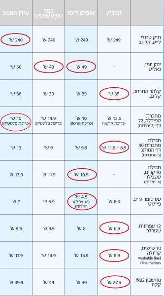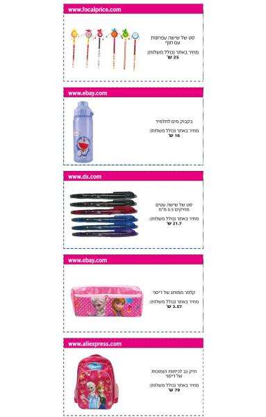 אופיס דיפו: מגוון מוצרים ב־1, 2, 3, 4 ו־5 ש'. לדוגמה מוצרים ב־4 ש': עטי ג'ל, קלמר, מנקב, עטי מחיקה וכו'. עוד מציעה הרשת ערכת בית ספר ב־59 ש' הכוללת תיק outdoor light, ומגוון מוצרים. 50 ש' מתנה לקניית תיק בקנייה ב־100 ש' ומעלה ממוצרי החנות.