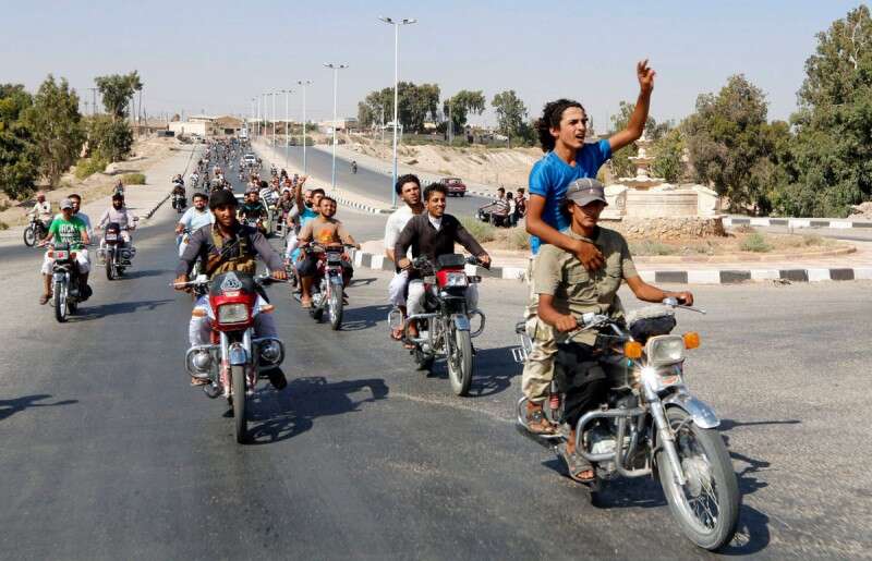 פעילי דאעש חוגגים את ההשתלטות על בסיס חה"א בסוריה, אתמול // צילום: רויטרס