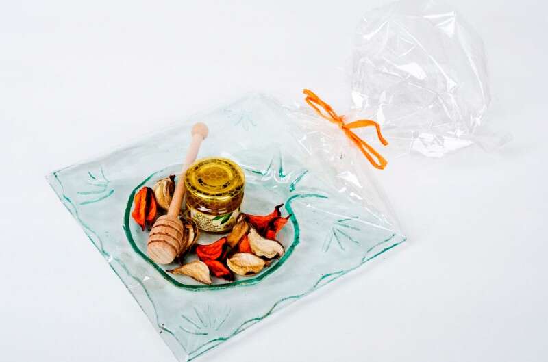 2. צלחת זכוכית עם הטבעה של רימון, ובה צנצנת דבש קטנה וכף עץ. המארז נעשה על ידי אמנים נפגעי נפש מעמותת דרור, הדואגת לשיקומם ולשילובם בקהילה במסגרת מיזם בית היוצר ברעננה. להשיג ברח' סולד 4 רעננה, טל': 09-7444302 או דרך אתר העמותה: droryo@zahav.net.il. מחיר המארז: 55 שקלים