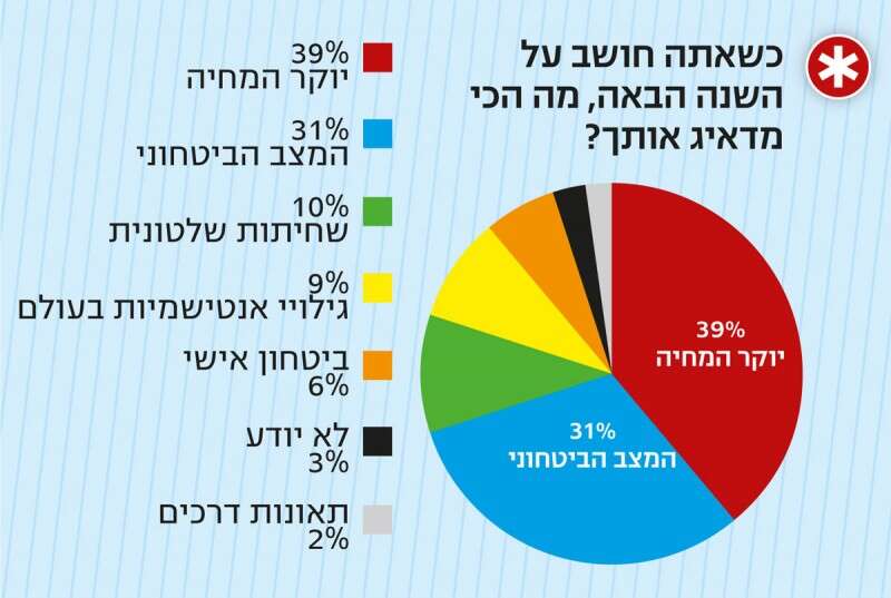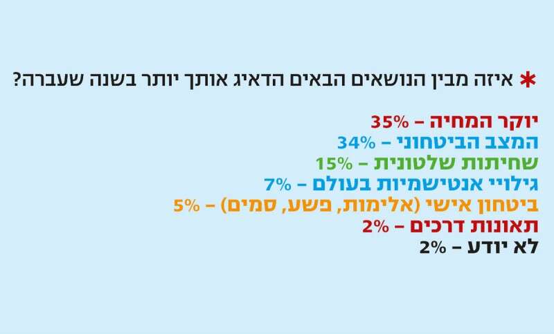 מבין הנושאים שהדאיגו את הישראלים בשנה שעברה בלטו יוקר המחיה (35%) והמצב הביטחוני (34%); בשנה הבאה, מעריכים הנשאלים, יוקר המחיה ימשיך לככב כנושא המדאיג מספר אחת: 39% סבורים כך, ואילו המצב הביטחוני נדחק מעט לאחור - 31% מעריכים שידאיג אותם בשנה הבאה.