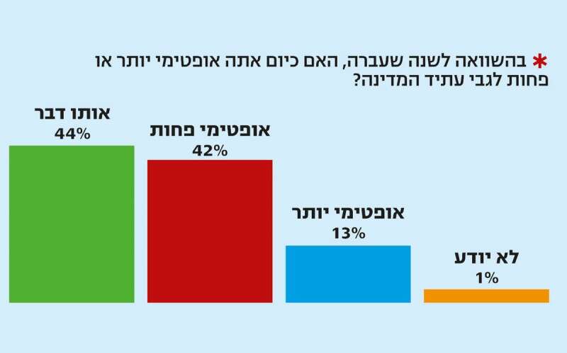 באשר למצב האישי של המשתתפים בסקר, החדשות טובות מעט יותר: 34% אמרו שהם אופטימיים יותר מבעבר לעומת 26% שאמרו שהם אופטימיים פחות. כלומר: מגמה הפוכה לאופטימיות ה"לאומית".