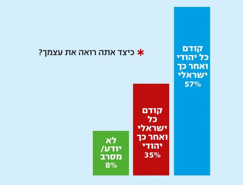 למרות דברים אלה, מרבית הנשאלים קרובים יותר לדתם מאשר לאזרחותם - 57% רואים עצמם קודם כל יהודים ורק אחר כך ישראלים, לעומת 35% שחושבים ההפך: אלה קודם כל מרגישים ישראלים ורק אחר כך רואים עצמם יהודים.