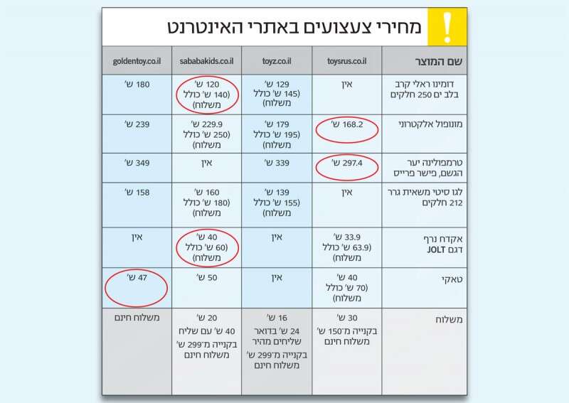 אופציה זולה נוספת היא אתרי אינטרנט בחו"ל דרך חברות שילוח. ירון בן אלי, מנכ"ל BUY2USA, אומר: "אנו מזהים גידול משמעותי ברכישות צעצועים דרכנו מארה"ב. קיימים פערי מחיר משמעותיים שיכולים להגיע אף ל־60%". אבל מבדיקה שלנו, גם זה לא תמיד מדויק. כך, למשל, לגו סיטי משאית גרר 212 חלקים דגם 60017 עולה באמצעות חברת BUY2USA 189 ש'. באתר TOYZ הישראלי אפשר לרכוש את הצעצוע עם משלוח ב־155 ש', ובאתר GOLDEN TOY ב־158 ש' (כולל משלוח).