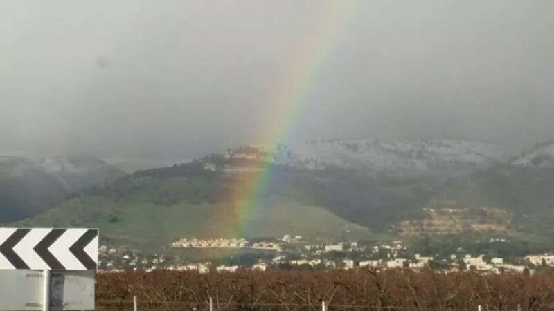 קשת בענן הבוקר על רקע צפת המושלגת // צילום: כתב רדיו קול רגע דודו פיניאן