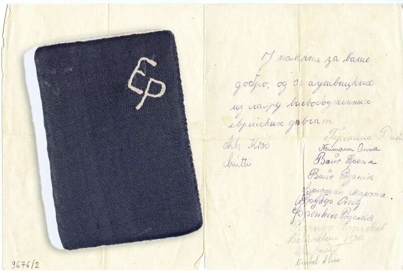 "לזיכרון על המעשים הטובים שעשית עבורנו. על החתום: 36 נערות יהודיות ששוחררו מאושוויץ".