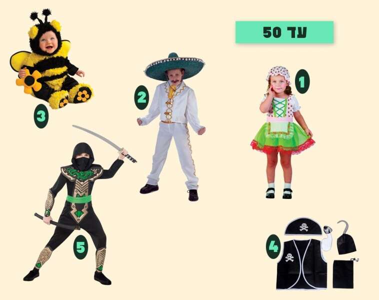 1. מיס תות, ביג שופ, 35 ש', 2. מקסיקני, כפר השעשועים, 40 ש', 3. דבורה רוביס, ביג שופ, 30 ש', 4. פיראט, eBay, כ-22 ש', 5. דרקון הנינג'ה, טויס אר אס, 50 ש'