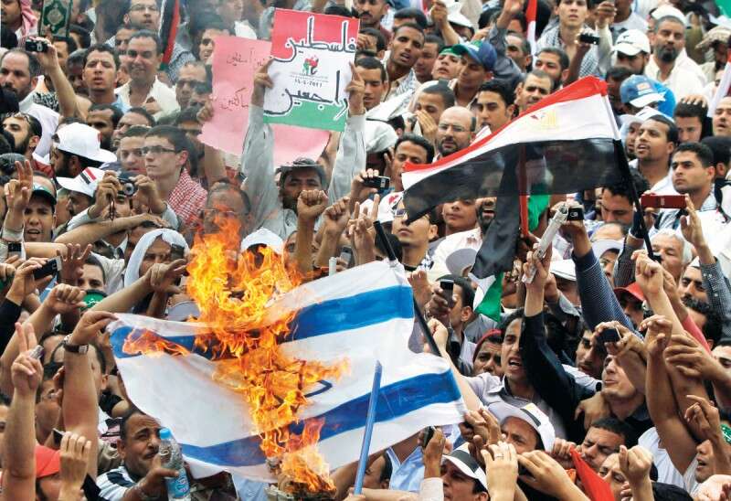 "אמרו לי ששורשים יהודיים זה פשע". המון מצרי שורף את דגל ישראל בהפגנה בכיכר תחריר, 2011 // צילום: רויטרס