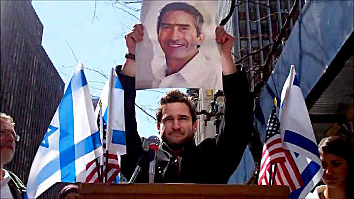 קובי נואם ברחוב בניו יורק, עם תמונת אביו רמי. "אדם צנוע וחביב, חייכן תמידי"