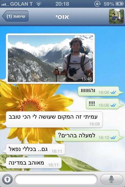 "זה המקום שעושה לי הכי טוב" כתב אור אסרף לחברתו עמית גרינברג במהלך הטיול בנפאל, לפני שנספה ברעידת האדמה. גרינברג פרסמה בחשבון הפייסבוק שלה צילום מסך של שיחה בינה לבין אסרף בוואטסאפ בה שלח לה אסרף תמונה שלו בפסגת ההרים ואמר כי הוא מאוהב בנפאל.