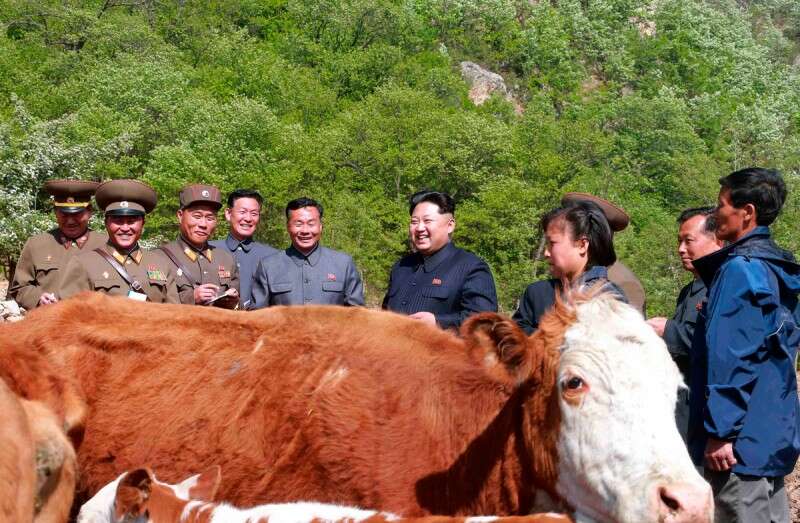 מטיילים ונהנים. קים ג'ונג און, פמלייתו ופרה // צילום: רויטרס