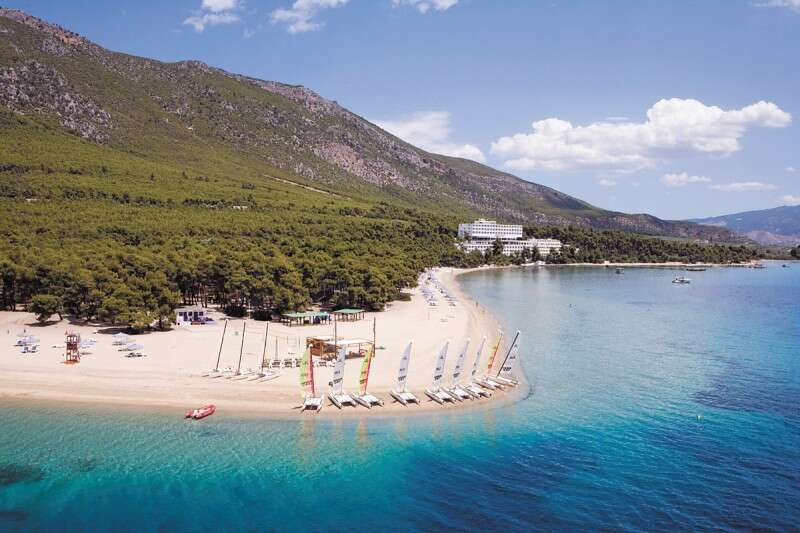 הגענו לגרגולימנו (Gregolimano) אחרי שעתיים נסיעה משדה התעופה של אתונה, ועוד חצי שעת הפלגה במעבורת. רק כשהמעבורת מתקרבת לחוף, מבחינים במבנה לבן שנחבא בין חורשת עצים עבותה שצמודה לרצועת החוף הזהובה, המקושטת בסירות קטנות, במיטות שיזוף ובשמשיות.