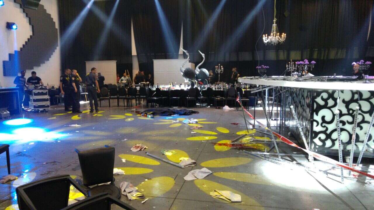 האסון אירע כתוצאה מקריסה של נברשת ענק, שמשמשת כאטרקציה מרכזית בעיצוב האולם – כאשר היא נעה מעלה מטה בעת שתחתיה רוקדים המוזמנים לאירוע. מסיבה שטרם ידועה, הנברשת ניתקה מהתקרה וקרסה במלוא כובדה על בר השתייה והחוגגים ששהו תחתיה.
