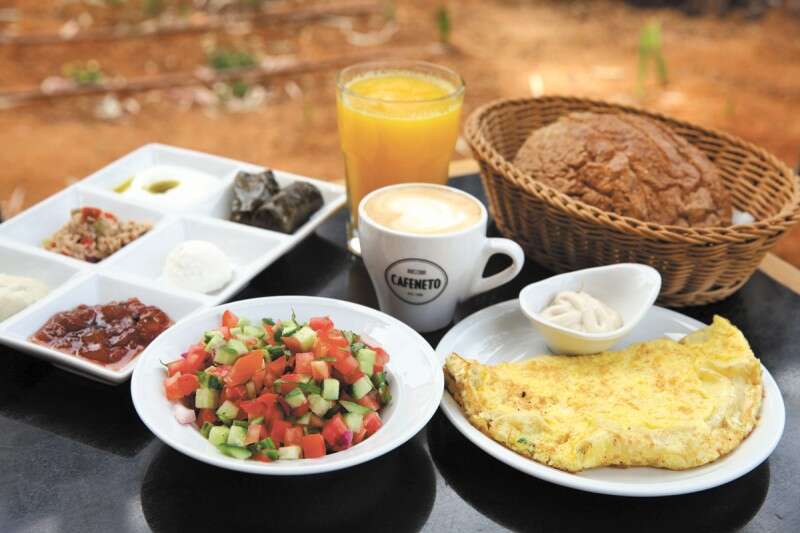 מה קיבלנו? ביצים לבחירה, 3 ממרחים לבחירה (לדוגמה גבינת מוצרלה, אבוקדו, פטריות צלויות), סלט ירקות גדול אך בסיסי, ארבעה חצאי פרוסות לחם, חמאה, שתייה קלה (קנינו קפה בנפרד). מיץ התפוזים לא סחוט. מיץ סחוט יעלה עוד 3 ש'.