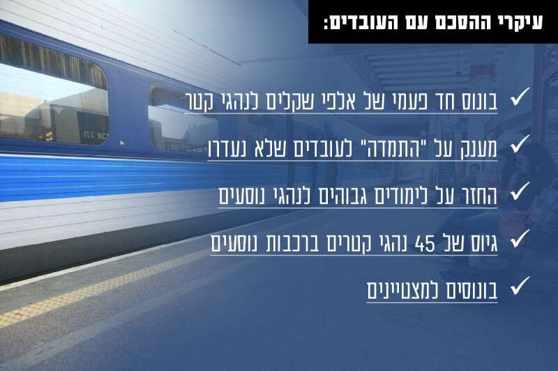 ועד עובדי הרכבת הצליח להשיג תוספות שכר מרשימות, בעיקר למאות מעובדי חטיבת הנוסעים ובהם: נהגי הקטרים, הפקחים ומנהלי התחנות. ההסכם הקיבוצי החדש כולל בין היתר גיוס של 45 נהגי קטרים בחטיבת הנוסעים. כמו כן, תעניק הרכבת בונוס הצטיינות מיוחד ל-30 עובדים בכל רבעון לתקופה של חמישה רבעונים, כאשר עובד יקבל בממוצע 2,000 שקל לרבעון.