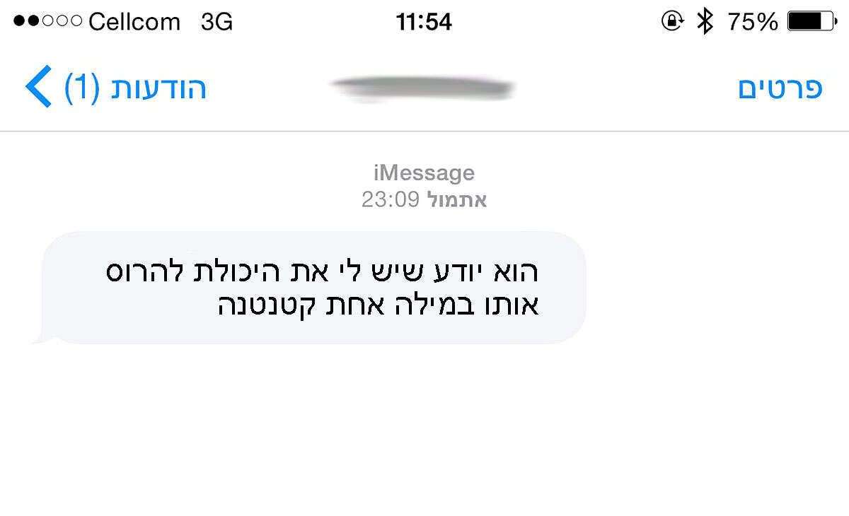 עוד היא כתבה במסרונים: "אני זוכרת שעשיתי לו הפתעה וסגרתי לו הפתעה עם חברים והוא עשה לי ברז....אין בעיה, אגב תמסור לו שממחר יפסיק לישון בשקט...מה החיים שלו מוחזקים בידיים שלי. אתה יודע שאין לי מעצורים בדברים האלה, אתה יודע טוב מאוד למה, עשיתי גם טוב בחיים, אמרתי לך שיהיה מספיק גבר לעמוד מולי. תגיד לו שיענה לטלפון כמו ילד בן 18. אני מוכנה לסגור איתו את העניינים ביפה". בהמשך אמר החשוד בבית המשפט כי המתלוננת כתבה לו שתיכף השוטרים יבואו לעצור אותו על זה שניסה לאנוס אותה ולעל כך שהיא מאיימת עליו.